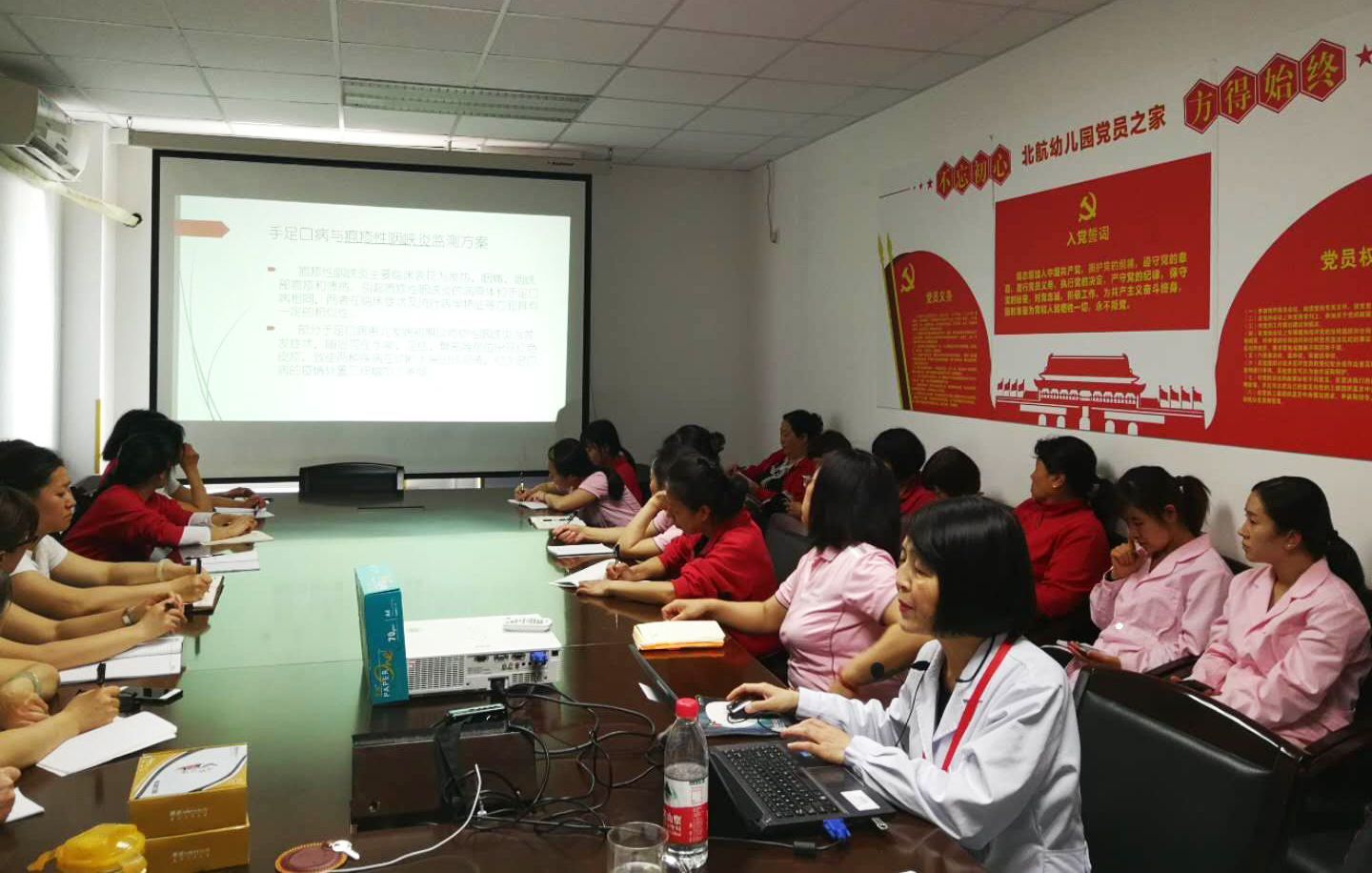 2018年4月20日,北航校医院儿童保健科石巧玲主任一行三名医生来到北航幼儿园,分批对教师们进行了幼儿春夏季传染性疾病的培训。我园后勤副园长陈洁,保健室主任陈永霞以及全体保健医生一同参加此次培训。培训中老师们认真聆听、记录,为防护春夏季传染病做准备。