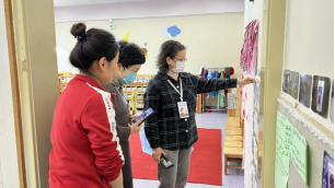 活动开始,滕瑾园长引导教师在观摩研讨中聚焦三点:通过追踪观察,发现记录教师的不同的游戏指导策略;通过分享讨论,梳理判断教师介入幼儿游戏的时机和方法;学会从幼儿的角度思考教师如何介入更适宜。在区域游戏观摩结束后,北航幼儿园教师参与到研修活动中,向观摩骨干教师详细介绍了班级主题活动下的区域活动情况。