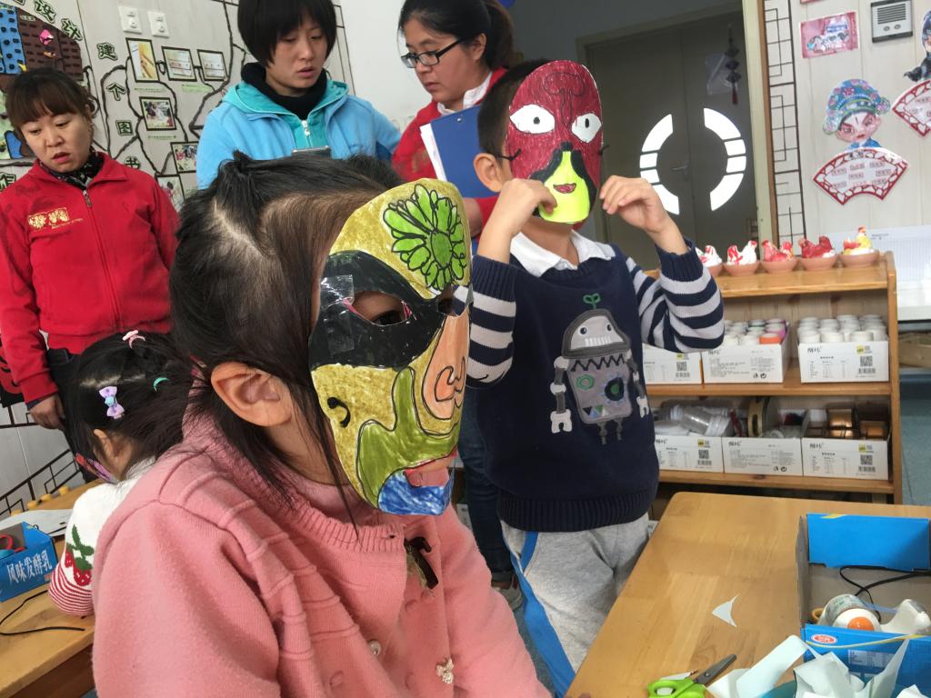最后我们共同制作了能够戴在脸上的脸谱,我对孩子们大胆尝试与探索的精神给予热情鼓励,使他们情绪振奋。其间,我有目的地进行个别辅导,尽力使所有的孩子都尝试成功。这样,不同水平的孩子面对老师设计的尝试目标,必然潜心投入,并从中获得自我成功的满足和喜悦,进而形成新的学习动机和愿望。
