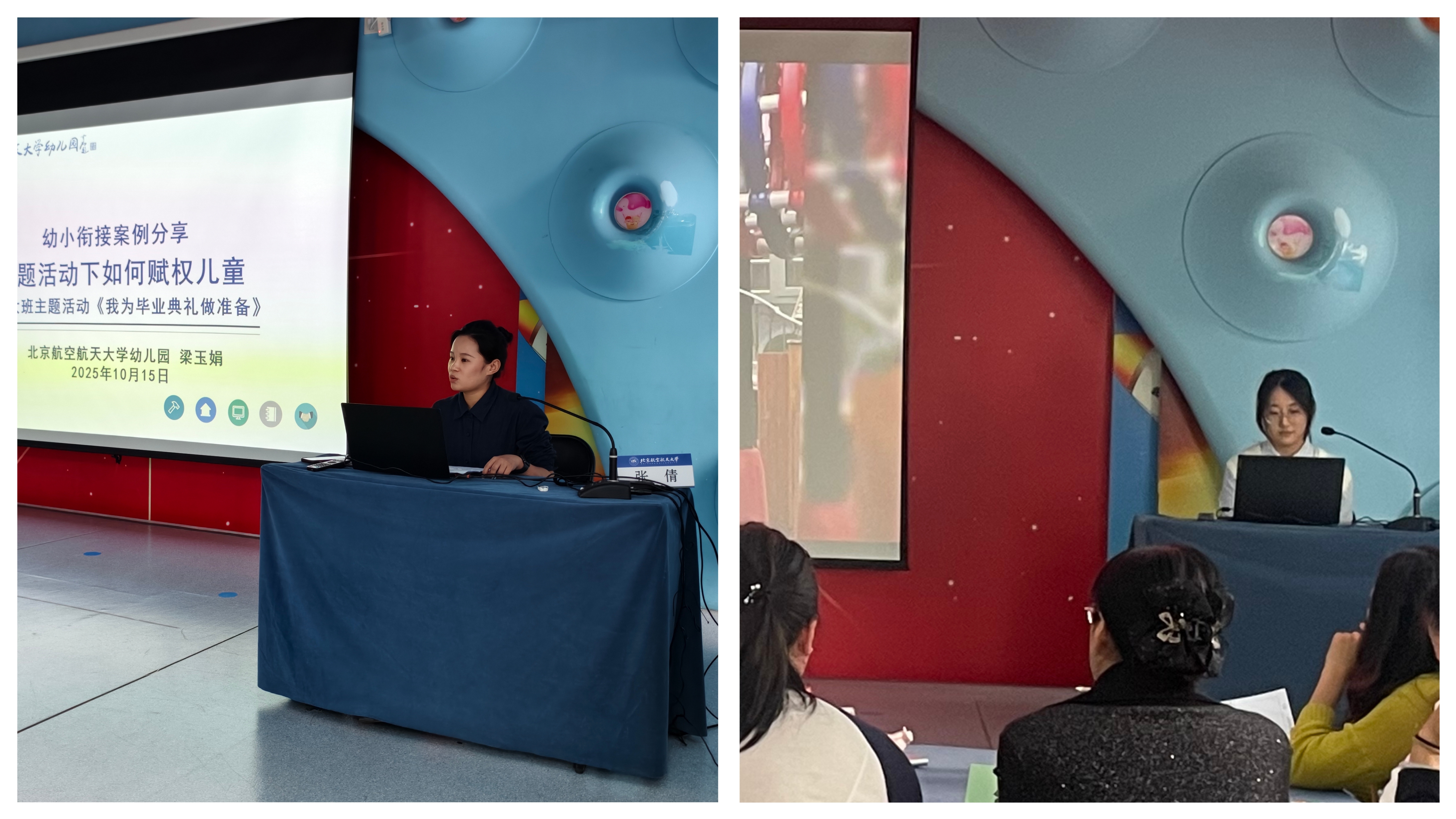 随后以园所三个实践案例,启发中阳县幼儿园管理者和骨干教师,重视自主游戏下教师的及时反思和经验梳理。荣获海淀区幼小衔接案例征集一等奖的梁玉娟老师用以“难忘的毕业典礼”案例,传递了主题活动下如何赋权幼儿的核心教育理念,以此阐释了开展主题活动同样能够赋权幼儿,倾听、走进儿童的理念。荣获北京市新教师风采展示一等奖的胡燕茹老师以“苹果蜂窝运沙包”的实践案例,证明儿童本身就是充满智慧、勇气与创造力的个体,他们无需被“塑造”,只需被“看见”。教育者要看见他们在游戏中展现的学习品质,看见他们解决问题的独特思路,看见每一个幼儿看似平凡的举动背后闪耀的成长光芒。荣获北京市幼儿园教师基本功展示活动一等奖的周彦清老师的大班游戏案例“登上高处玩游戏”也在现场进行了分享。案例中阐述的“适时退后”与“精准介入”的教育智慧,是园所教育过程充分倾听幼儿、赋权教师的生动缩影。其“慢教育”理念与“小我向大我”的转变,彰显了新时代幼教工作者从“教书”到“育人”的价值升华。