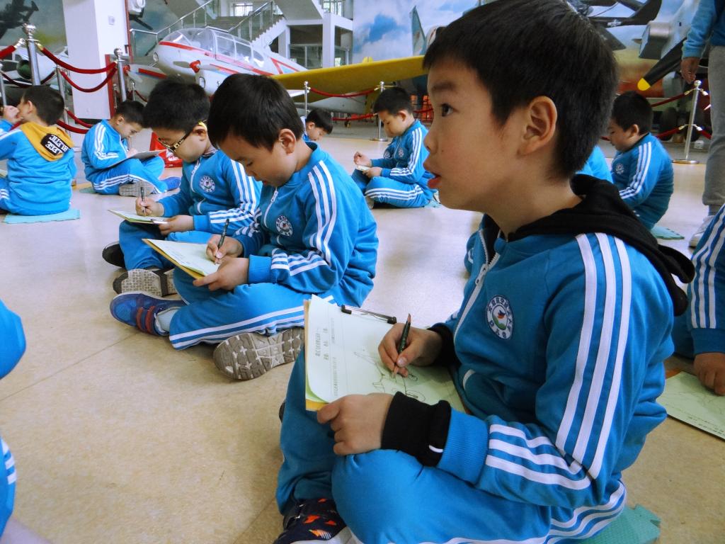 对于参观博物馆,不同年龄层班级的参观方式也不相同,于小班而言,教师会放慢脚步,用通俗易懂的方式大致讲解航空馆的展品,幼儿主要表现为对飞机或航天器造型的好奇。中班幼儿则会根据不同的展品,对比观察比较相同与不同之处。"为什么这个飞机是圆头,那个飞机却是尖头呢?""为什么这个飞机有两层机翼?"等等问题,开始探究飞机的设计与飞行原理。而大班幼儿已经具备概括、分析、推断分析能力,教师会根据具体的飞机设计出记录单,让孩子在活动中了解简单的飞行原理。老师也会具体介绍展品的创作历程,幼儿惊叹道"原来这个飞机是我们国家的科学家设计的""原来还有我们北航人自己制作的飞机,真厉害!"在活动中激发幼儿"爱祖国、爱航空、爱航天、爱北航"的"四爱"精神。