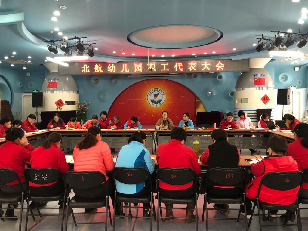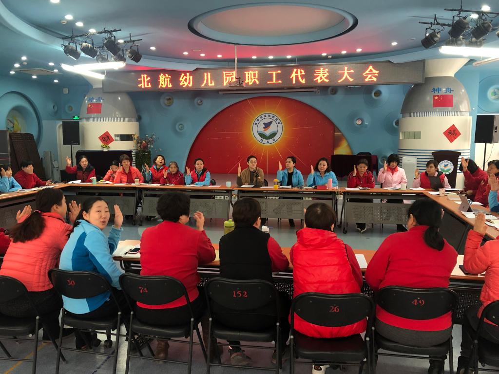 2019年1月3日上午,在北航幼儿园多功能厅召开全园职工代表大会,全园各班级部门代表参加会议。由幼儿园工会主席彭竞主持会议,幼儿园园长彭博,后勤副园长兼书记陈洁,业务副园长刘冬梅与全体办公会成员列席会议。