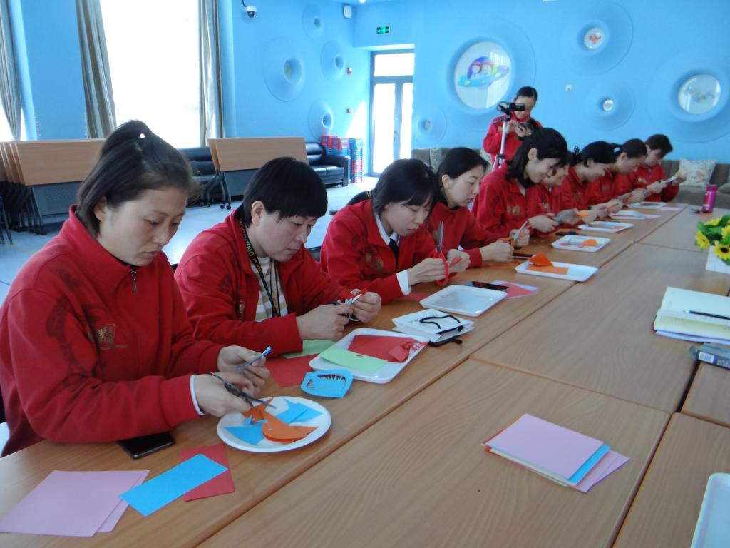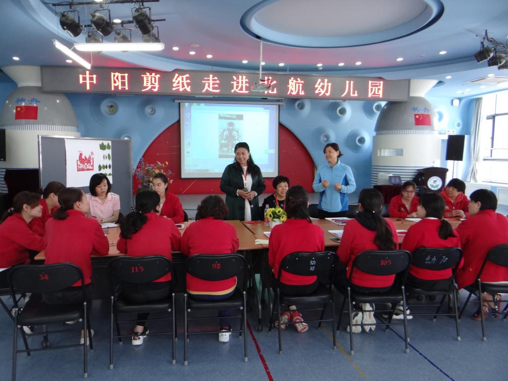 期间,来自中阳县星宇南园的杨园长为北航幼儿园的部分教师开展《中阳剪纸走进北航幼儿园活动》。杨园长从中阳剪纸特点出发,讲述中阳独有的非物质文化遗产剪纸的魅力,并结合3-6岁幼儿年龄特点,与北航幼儿园老师们交流了在剪纸艺术教育教学活动中的心得体会。之后,北航幼儿园的老师们也拿起剪刀与彩纸,一起动手从直线、曲线和锯齿等及基本形状剪起,体验创作民间艺术的乐趣与韵味。