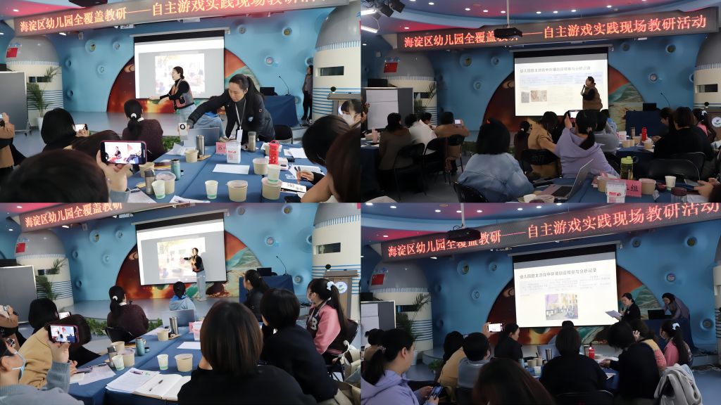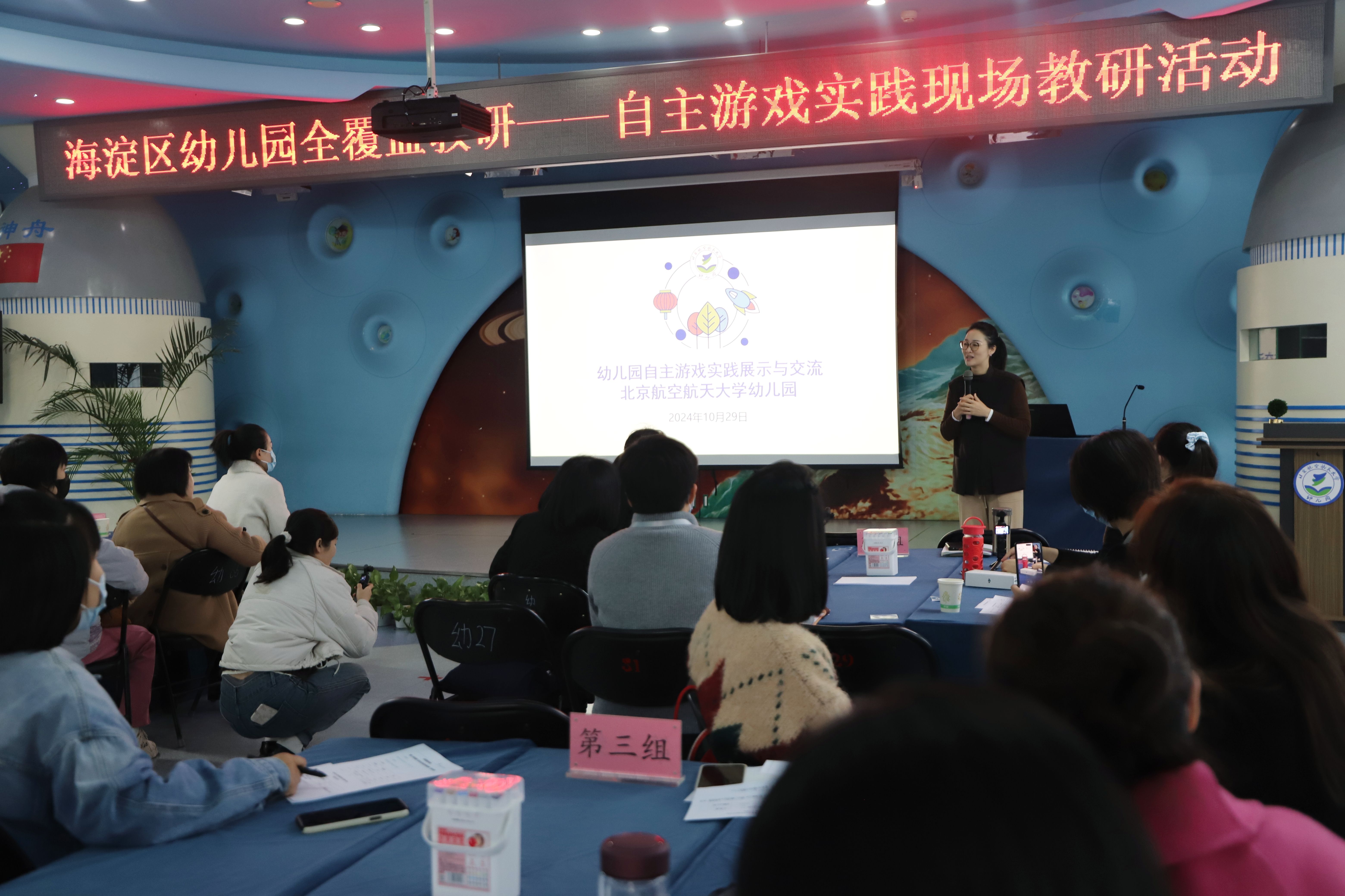 2024年10月29日海淀区教师进修学校学前研修室教研员周立莉、赵蕊莉、北京市特级教师朱金岭带领全区40名兼职研修员走进北京伊人99幼儿园,开展了首场全覆盖教研项目——“落实《评估指南》的自主游戏实践专题教研”活动。
